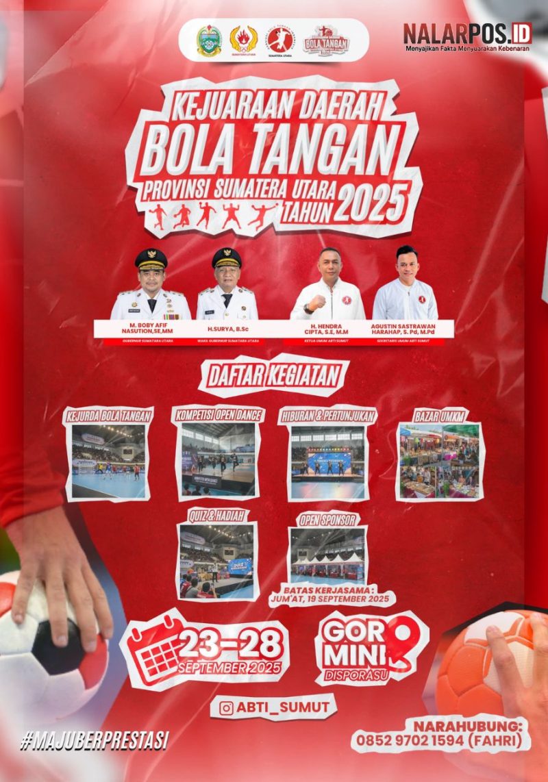 MEDAN | NALARPOS.ID — Ajang olahraga bergengsi kembali hadir di Sumatera Utara! Kejuaraan Daerah Bola Tangan Provinsi Sumatera Utara Tahun 2025 siap digelar pada 23–28 September 2025 di GOR Mini Disporasu.